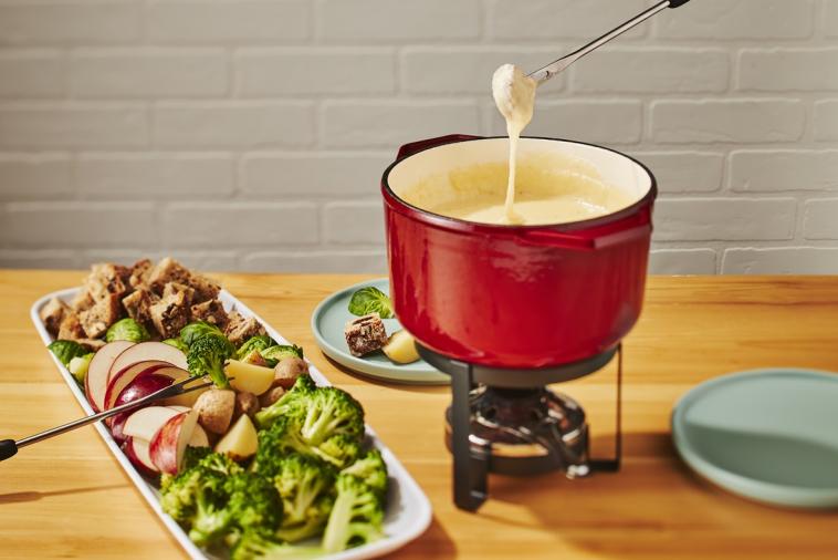 Régalez-vous avec une fondue au fromage crémeuse au jus de pomme, accompagnée de pain, charcuteries, légumes et fruits. Préférée des enfants.