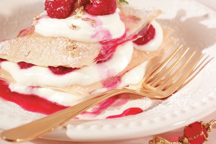 Déposer un rectangle dans chaque assiette, garnir de crème, puis de framboises. Répéter pour faire un autre étage. Couvrir d'un rectangle de pâte. Utiliser le jus des framboises pour décorer les assiettes. Servir immédiatement.