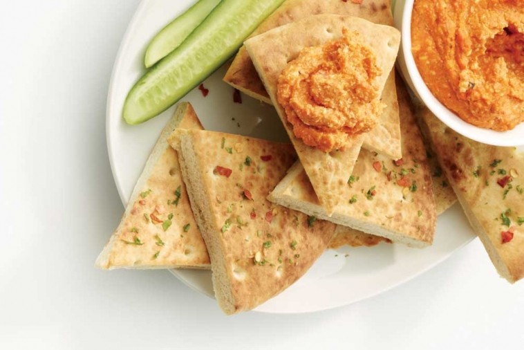 Étendre dans le plat préparé allant au four. Cuire au four environ 20 minutes, ou jusqu’à ce que la préparation soit chaude et qu’elle commence tout juste à dorer sur le pourtour. Servir la tartinade accompagnée de pointes de pita grillées et de concombre en tranches épaisses ou quartiers